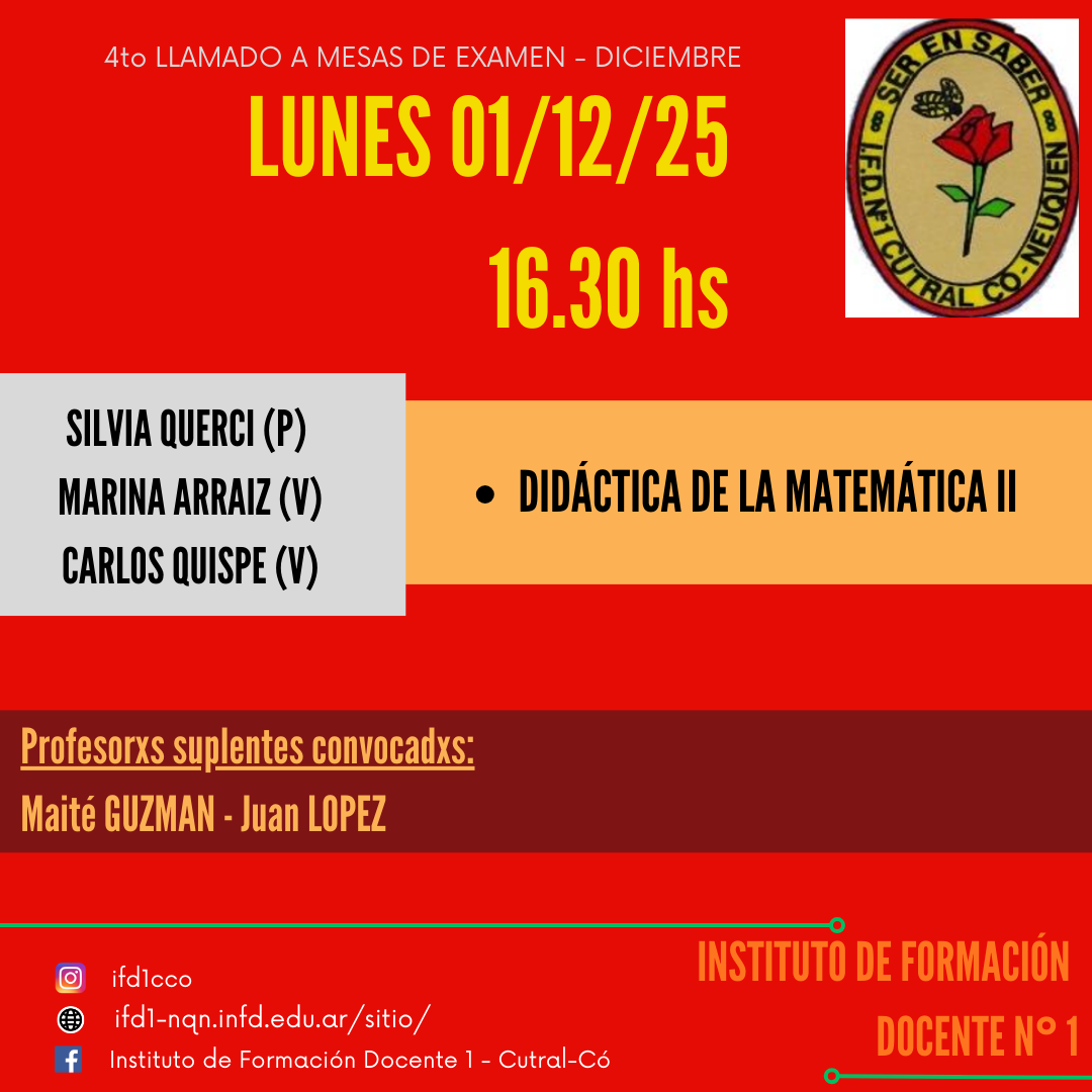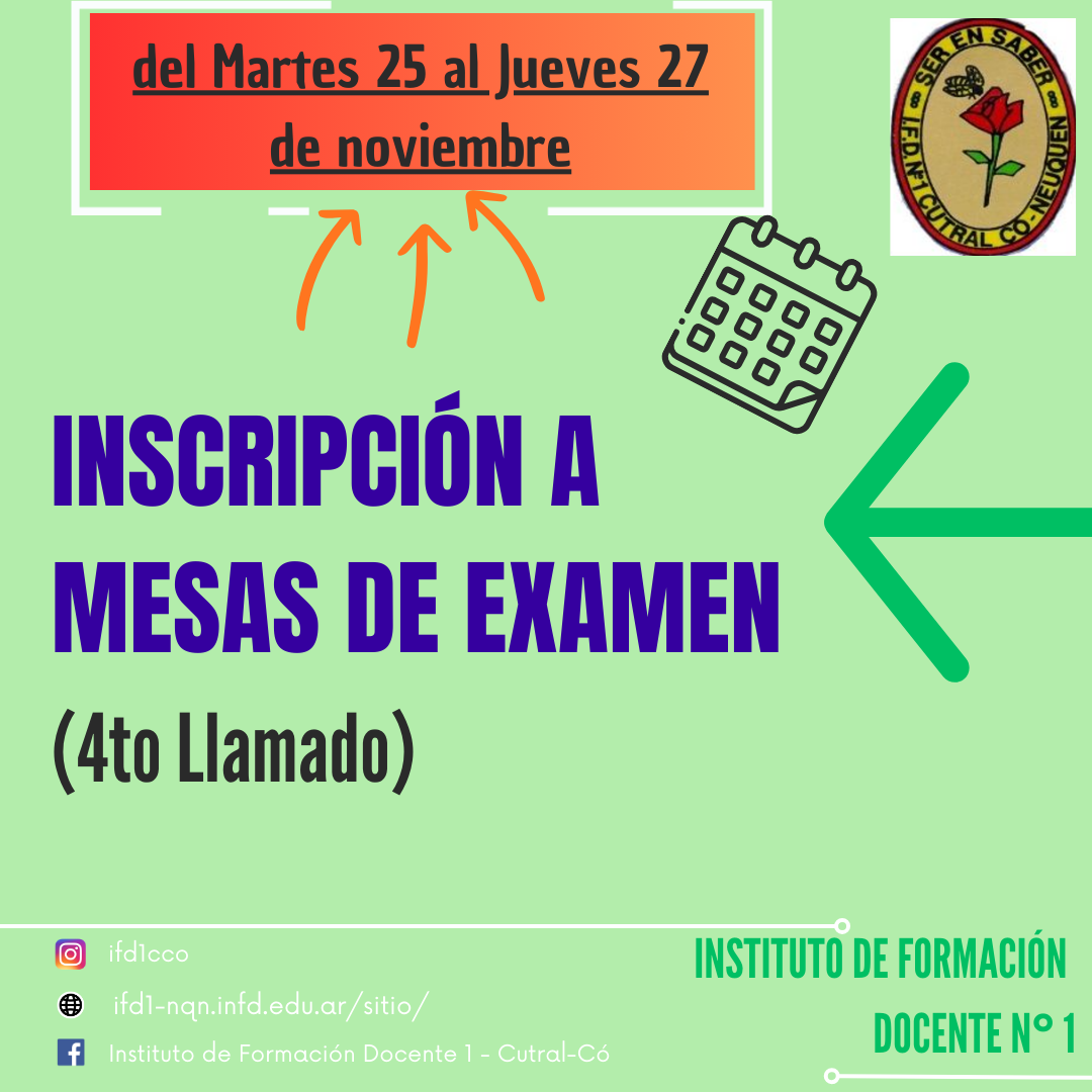 Recordamos que desde el martes 25 hasta el jueves 27 de noviembre es el período de inscripción para el 4to llamado de mesas de examen del 2025, que comienzan el lunes 01 de diciembre.
